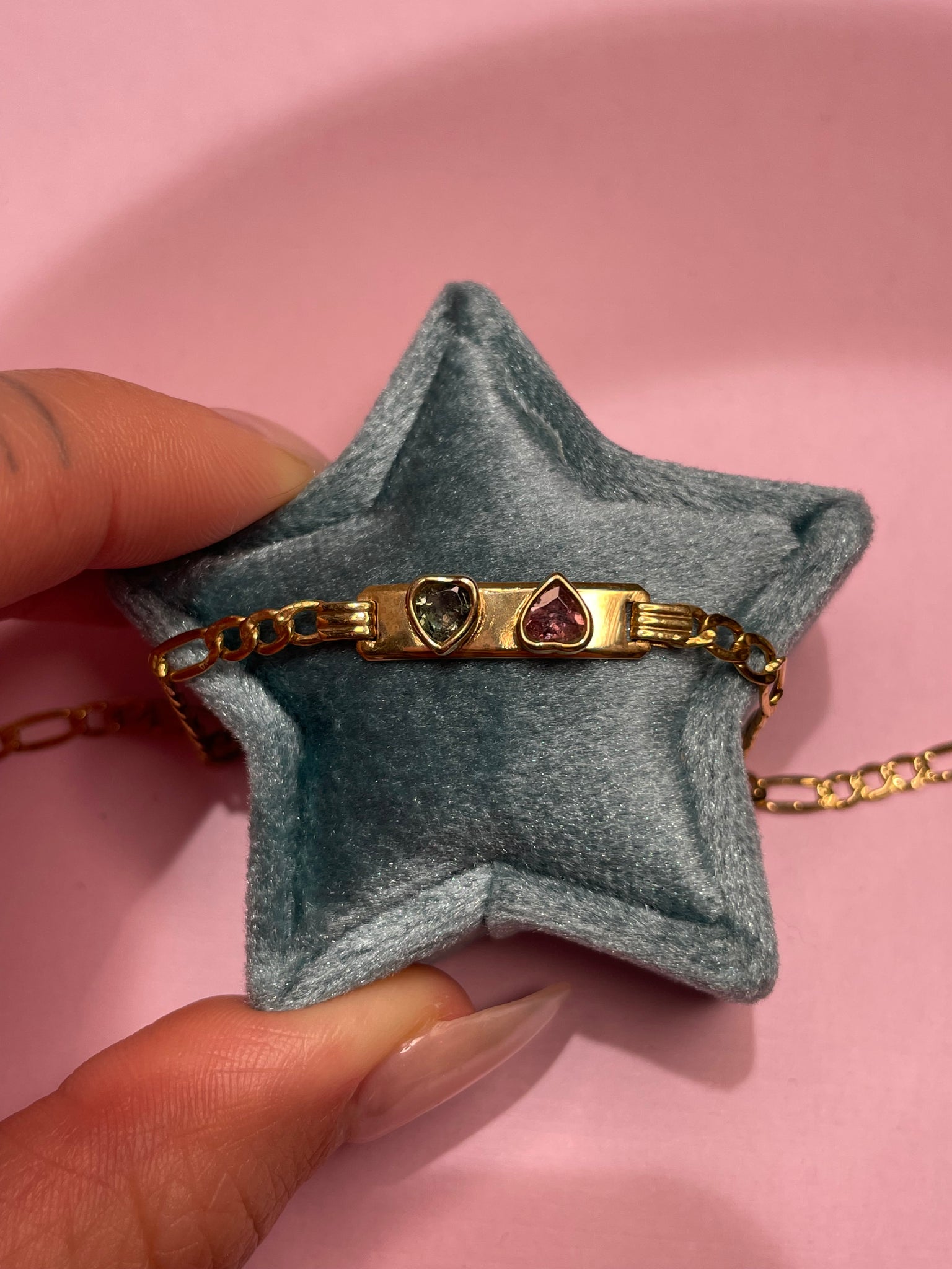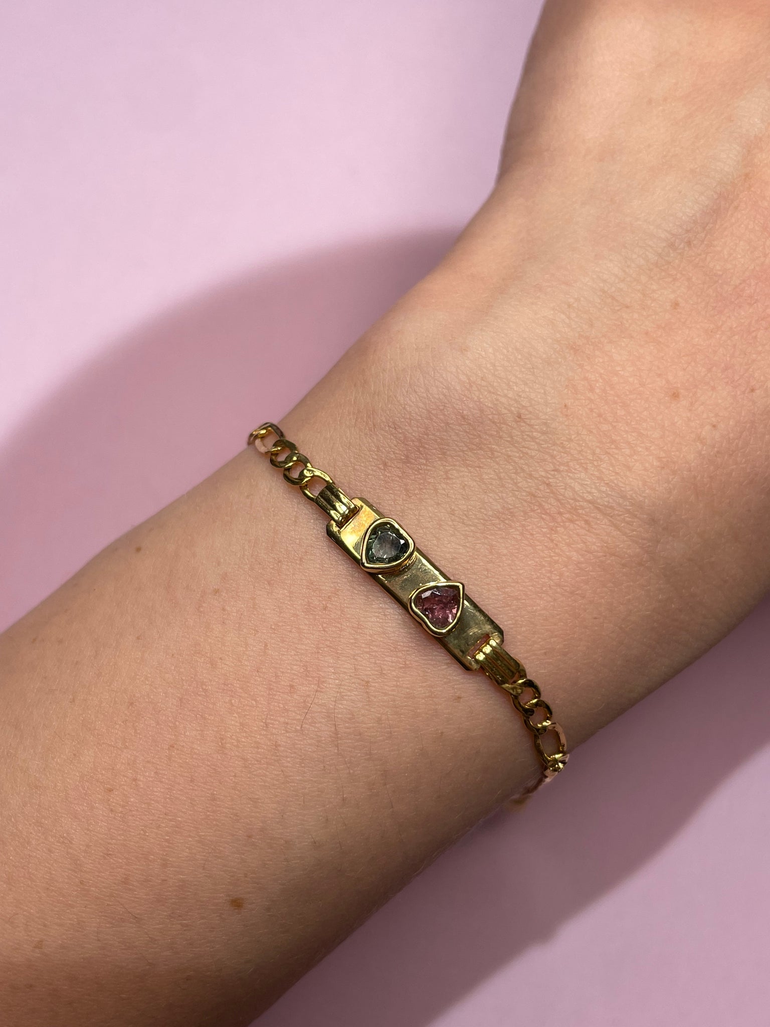 10K solid gold custom made double bezel pink & blue heart tourmaline ID bracelet!