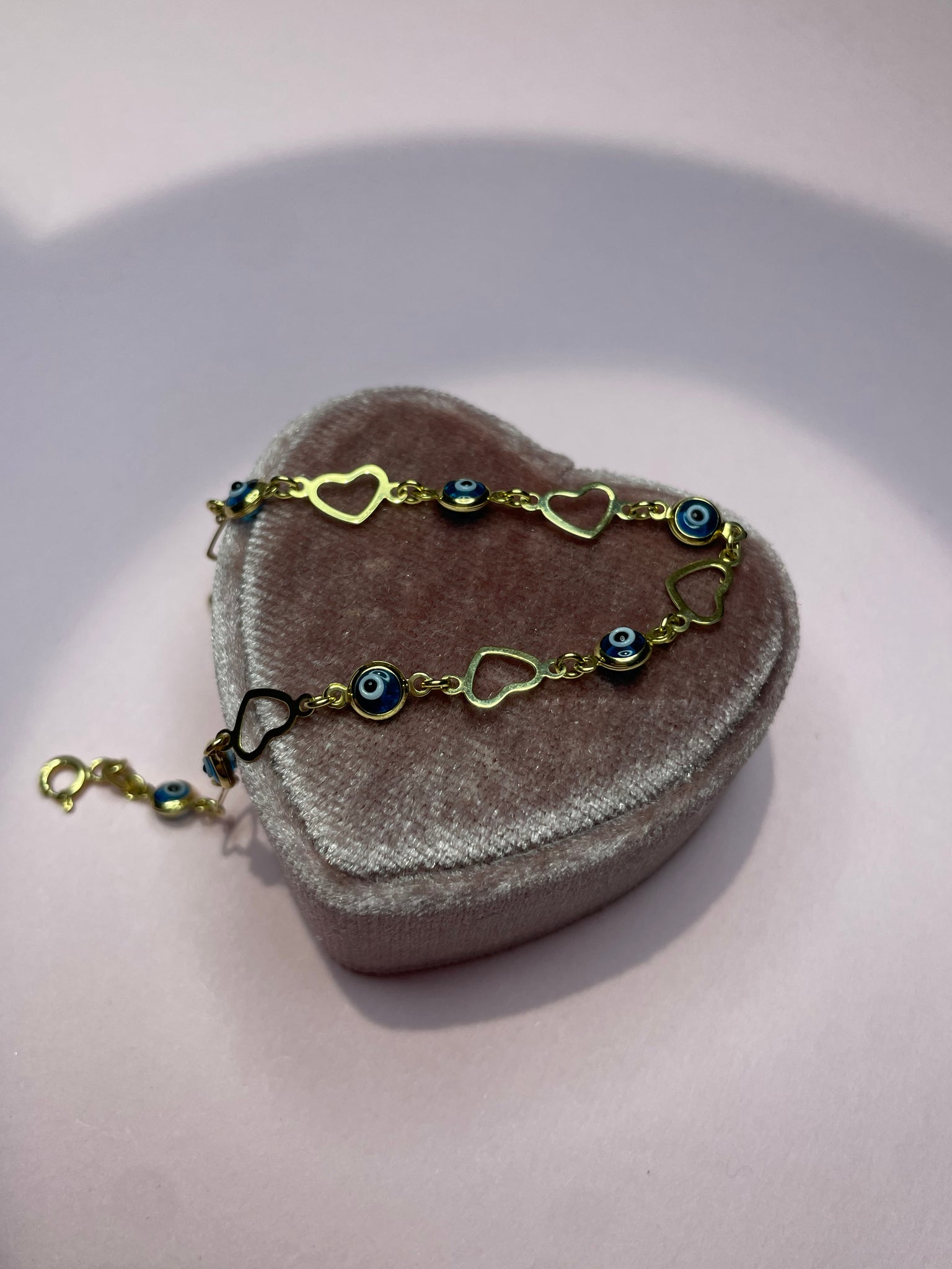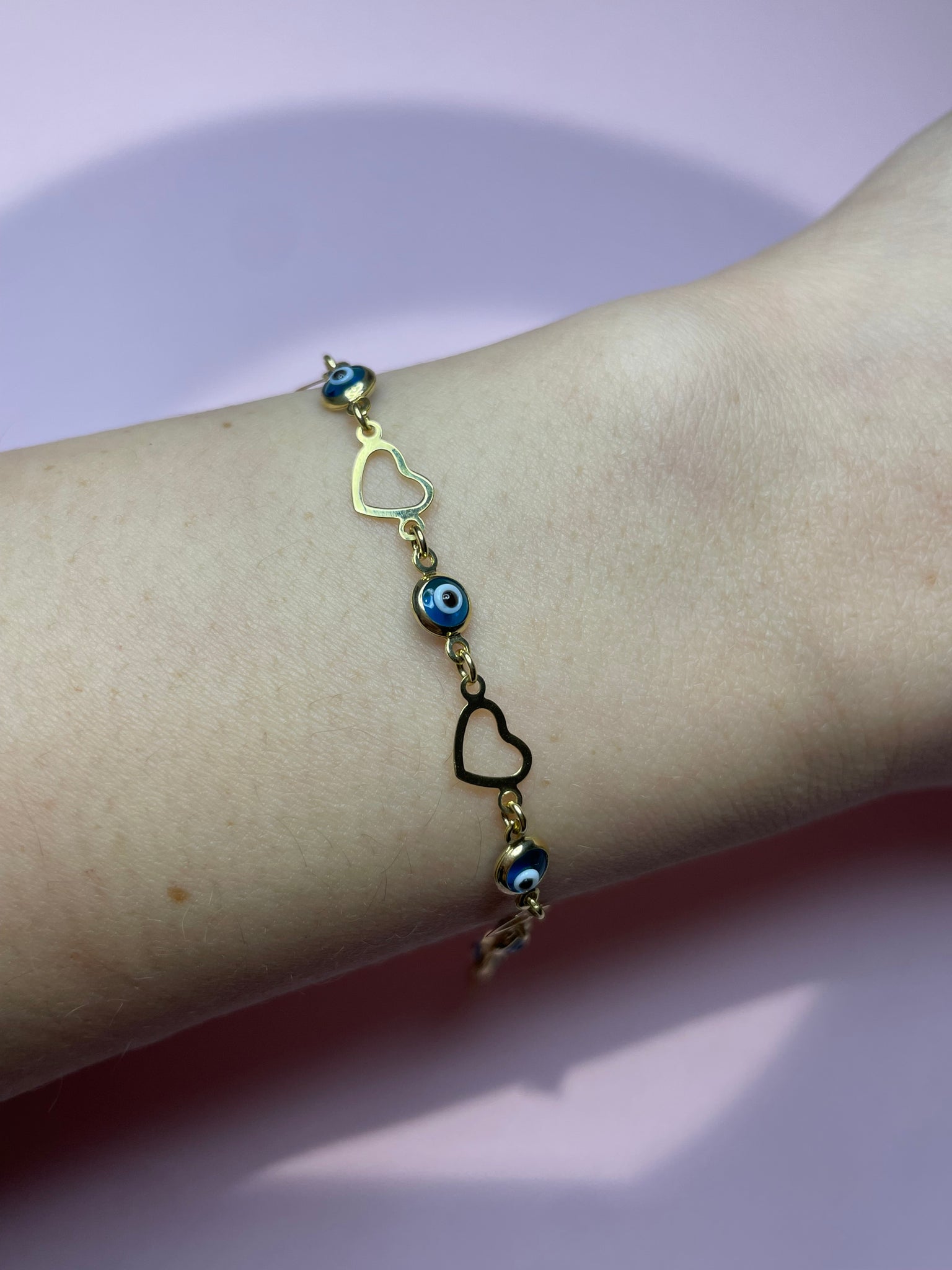 10K solid gold evil eye enamel heart station bracelet